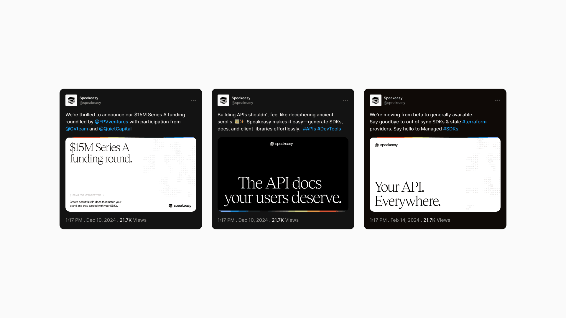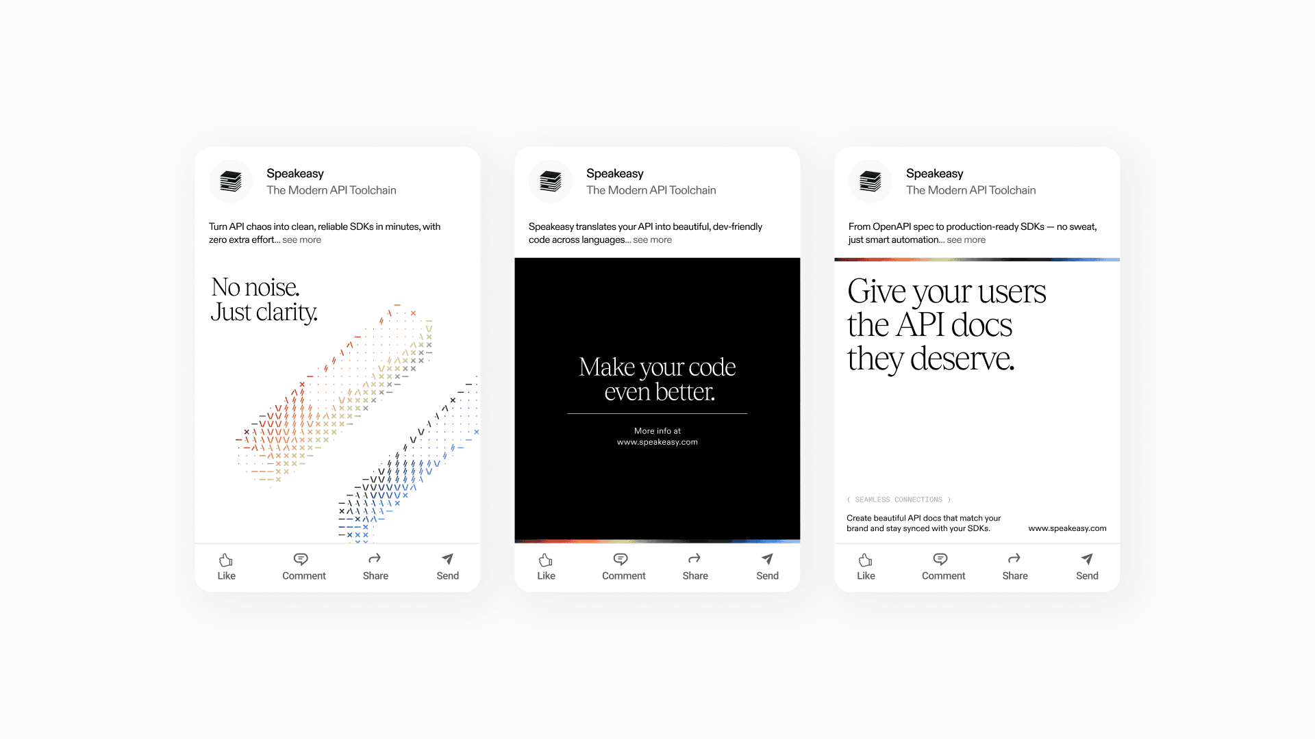 Speakeasy builds tools devs love. The SDKs, the docs, the workflows: clean, fast, and obsessive about clarity. We wanted the brand to feel the same way.